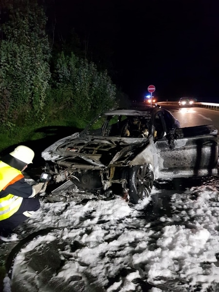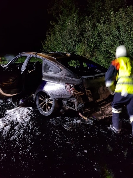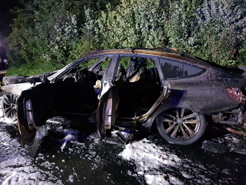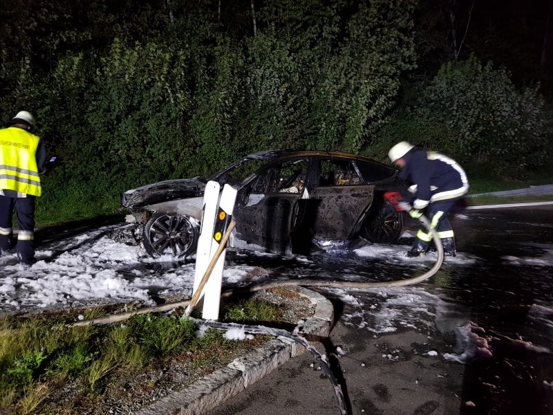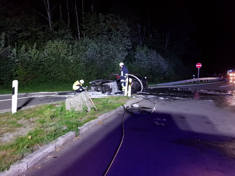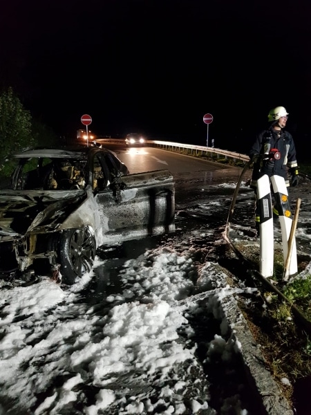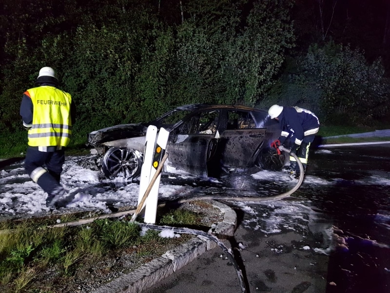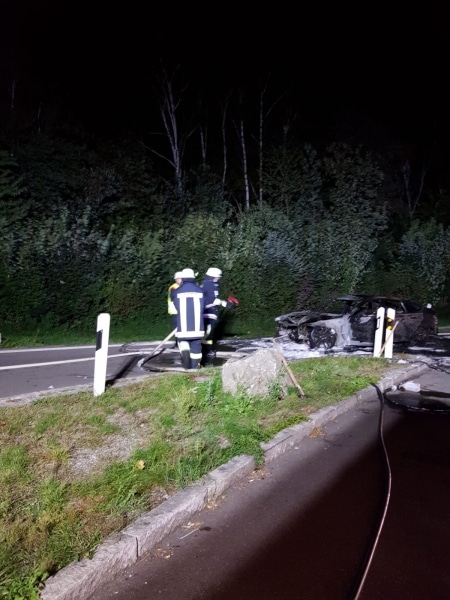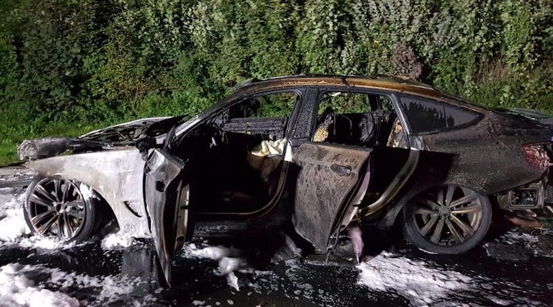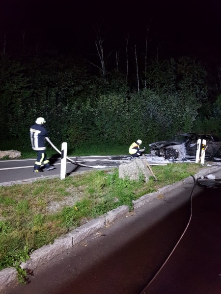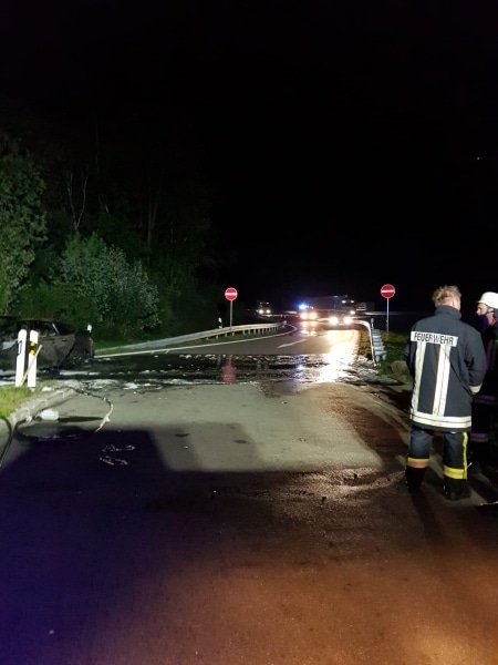 Die erste Meldung lautete “Brand PKW in Offenberg”. Kurz vor der vermeintlichen Einsatzstelle würden wir dann von der Leitstelle informiert dass die Einsatzstelle auf dem Offenberger Parkplatz auf der BAB A3 in Fahrtrichtung Regensburg sei. Über die Befehlsauffahrt könnten wir die Einsatzstelle ohne Zeitverzug erreichen. Dort angekommen befand sich ein BMW bereits im Vollbrand. Durch die hohe Hitzeentwicklung war auch der direkt angrenzende Baum- und Strauchbestand schon in Mitleidenschaft gezogen. Über den Fahrzeugtank wurde direkt mit dem Löschangriff mittels Schaumrohr und mittels zweitem Rohr mit Wasser mit dem ablöschen der Vegetation begonnen. Zur Sicherstellung des Wasservorrates wurde das Tanklöschfahrzeug der FFW Metten nachalarmiert. Die Sperrung des Parkplatzes wurde von den Offenberger Kameraden übernommen.