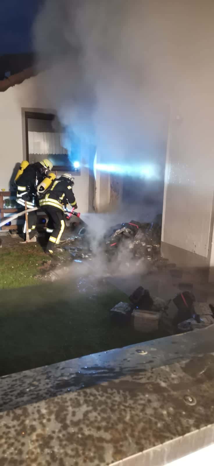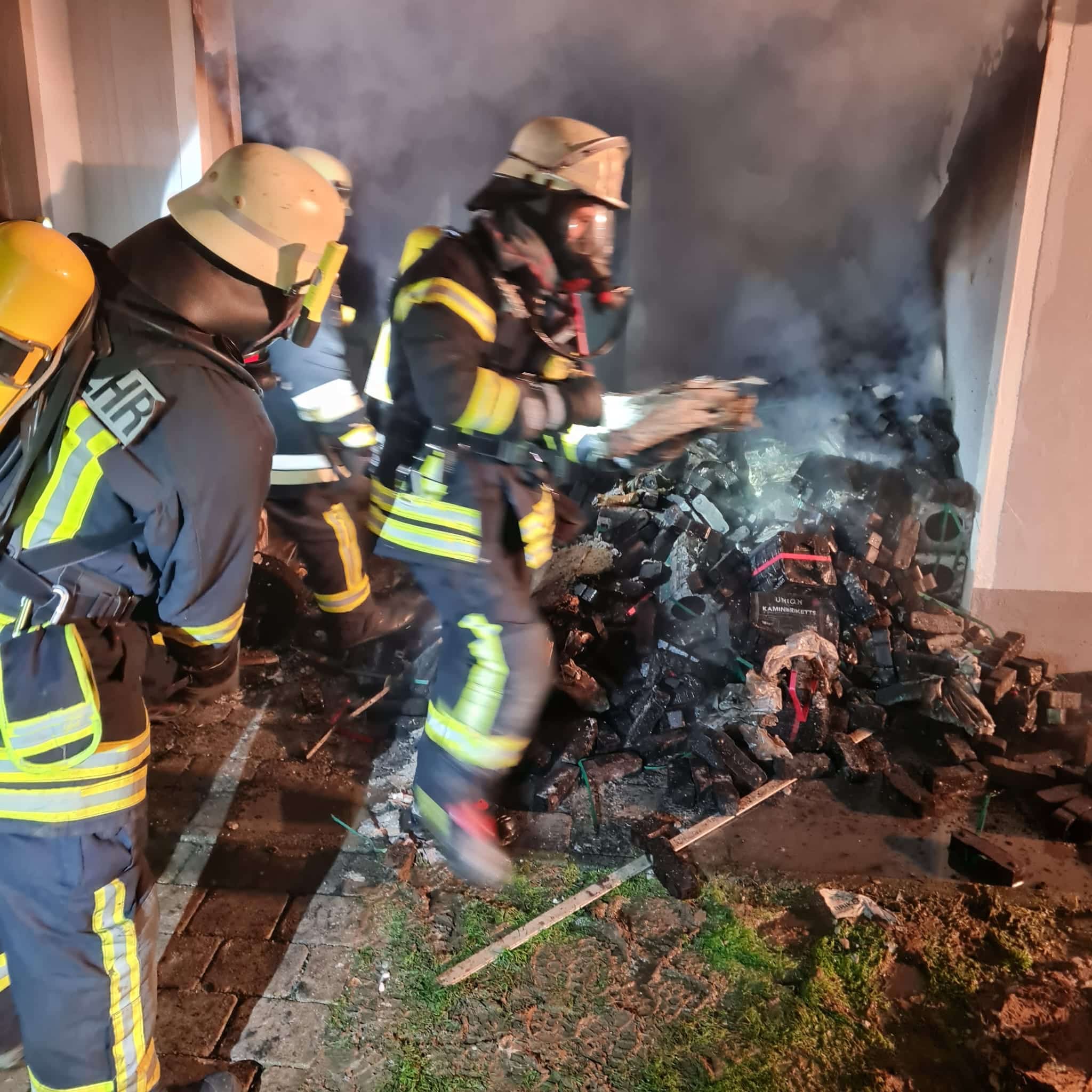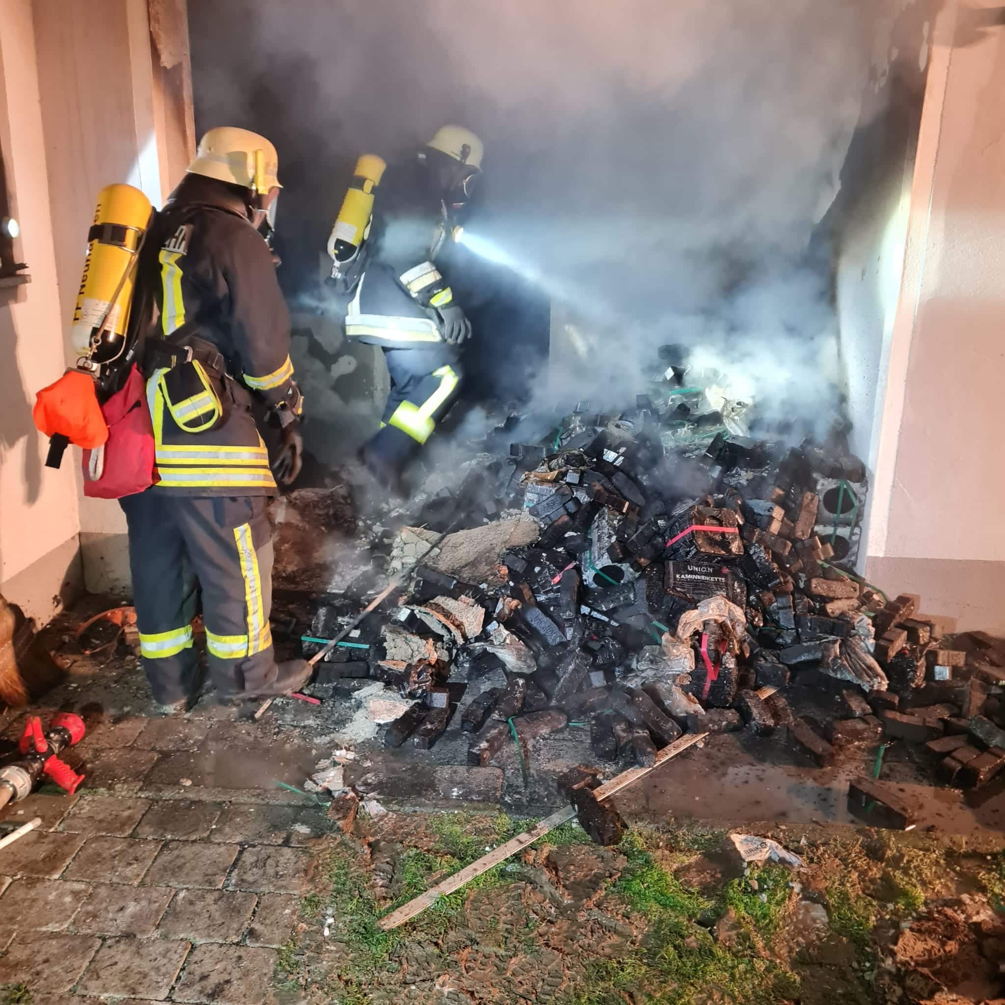 Die am Gebäude gelagerte Kohle zum Heizen brannte zum Teil bereits mit offener Flamme und starker Glutbildung. Diese wurde unter Atemschutz umgelagert und abgelöscht. Zur Sicherung gegen Wiederentzündung wurde diese anschließend mit ausreichend Löschschaum abgedeckt.