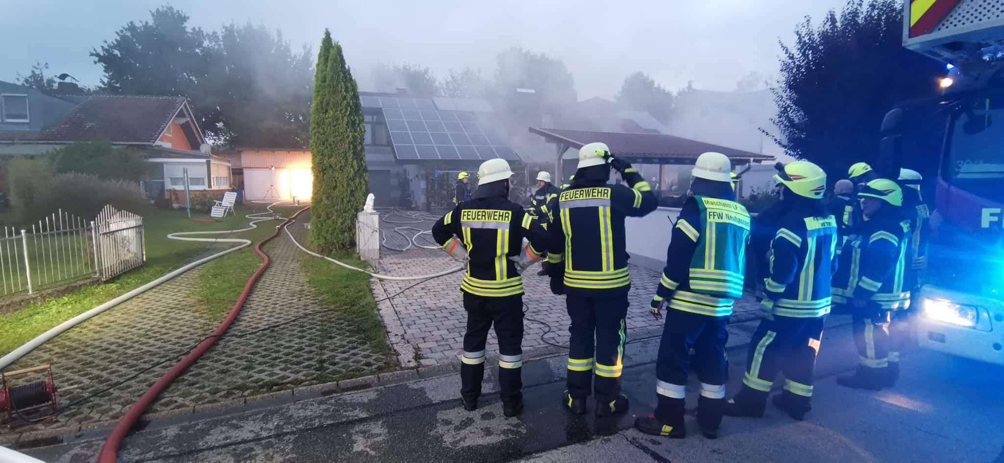 Aufmerksame Nachbarn meldeten am frühen Donnerstag morgen eine starke Rauchentwicklung an einem Nachbargebäude. Beim Eintreffen stellten wir eine massive Rauchentwicklung sowie offenes Feuer an der Rückseite eines Wohngebäudes fest, das auf den Dachstuhl übergreifen zu drohte.