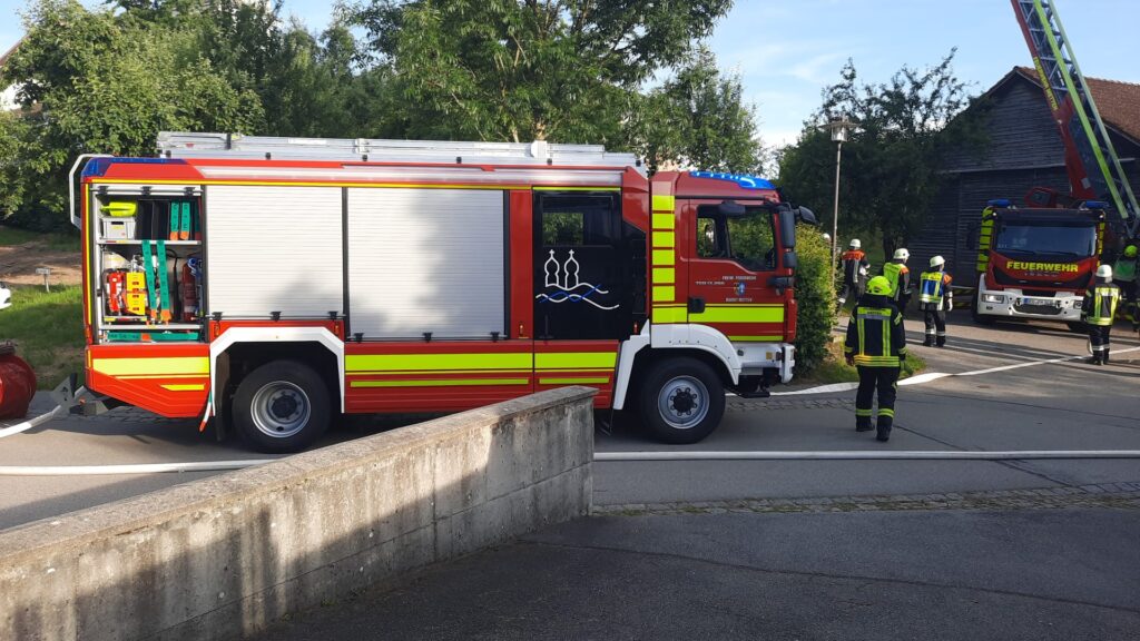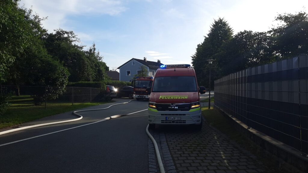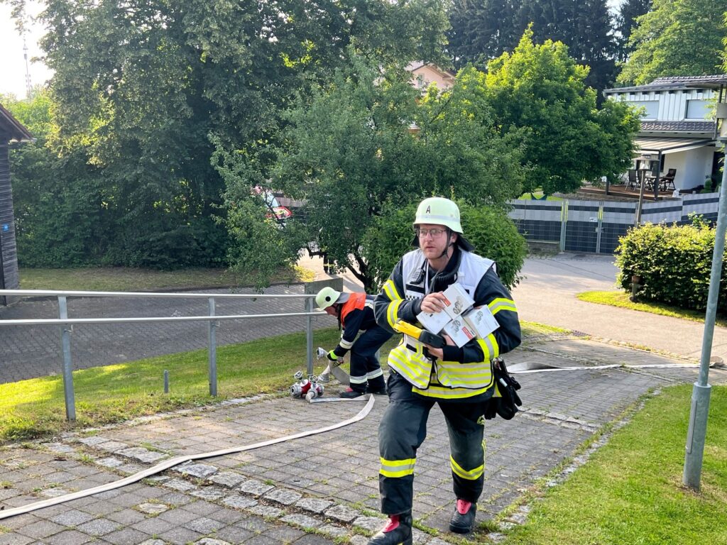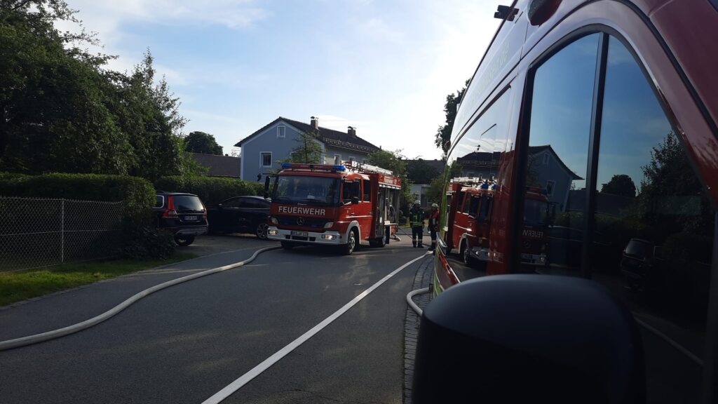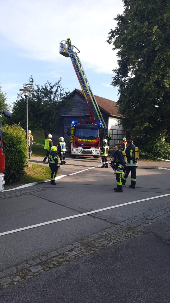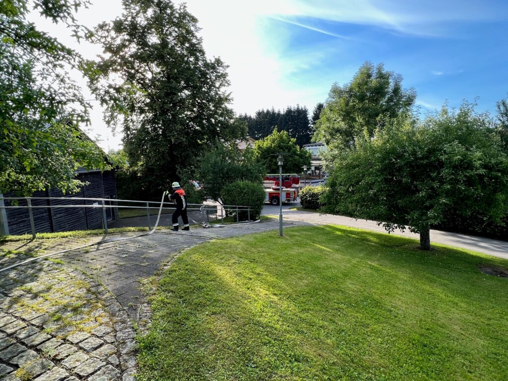 Mit dem Meldebild “ausgelöster Rauchmelder, Personen in Gefahr” wurden die teilnehmenden Gemeindewehren aus Neuhausen, Offenberg, Penzenried-Aschenau und Buchberg sowie die Nachbarwehr Metten mit der Drehleiter und dem HLF zum Objekt alarmiert. Dort galt es, umgehend mit der Personensuche zu beginnen. Da bereits Rauch ersichtlich war konnte dies nur unter Atemschutz erfolgen. Währenddessen bauten die Wehren aus Offenberg und Penzenried-Aschenau jeweils eine B-Schlauchleitung vom ca. 170m entfernten Dorfweiher auf und speisten hiermit das Löschgruppenfahrzeug der FFW Neuhausen sowie die Drehleiter aus Metten. Die FFW Buchberg entnahm das Wasser aus dem Unterflurhydranten ggü. dem Zenger Dorfwirt und baute einen Löschangriff über den Vorplatz der Kirche zum Brandobjekt auf. Nach ca. 8 Minuten nach Alarm hatten die Wehren den ersten Löschangriff begonnen und die “Übungsdarsteller” konnten ebenfalls alle “gerettet” werden.