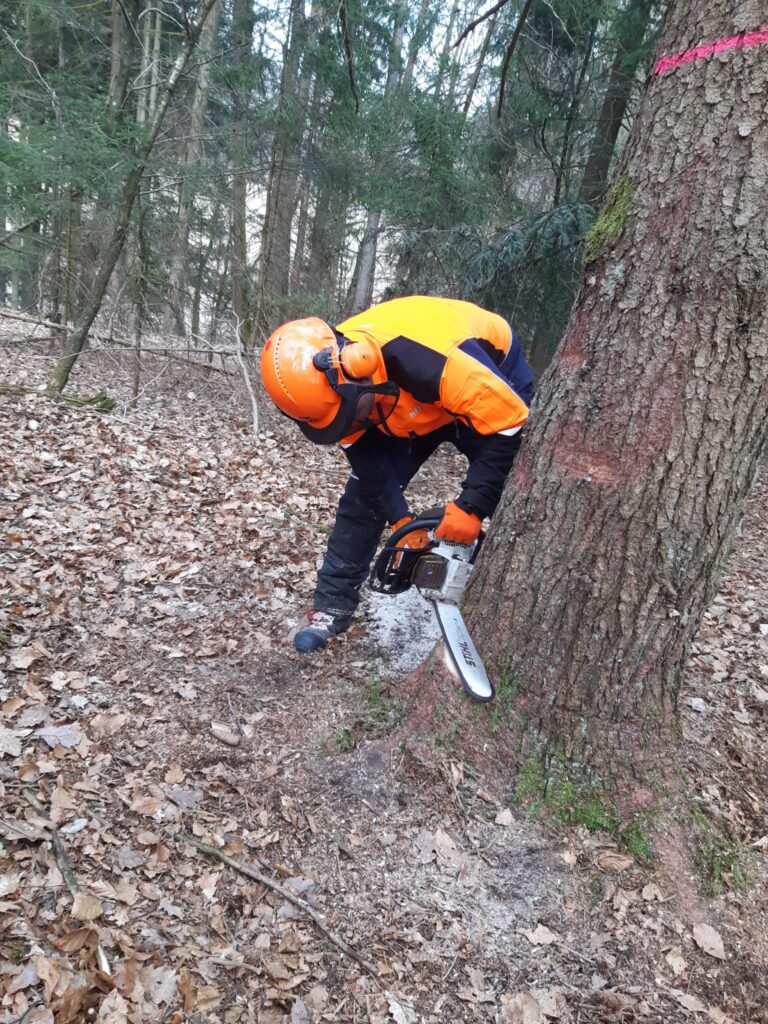 Im dritten Anlauf konnte endlich der seit langem geplante Motorsägenlehrgang durchgeführt werden. Im Theorieteil am Donnerstag und Freitag jeweils von 18.00 Uhr bis 22.00 Uhr wurden die Teilnehmer von Ausbilder Andreas Köck u.a. über die Gefahren im Umgang mit der Motorsäge ausgebildet, Auch die Gerätepflege war Bestandteil der Ausbildung. Am Samstag ging es dann “ins Hoiz” um die gezeigten Techniken in der Praxis zu üben und den sicheren Umgang mit der Motorsäge zu erlernen.