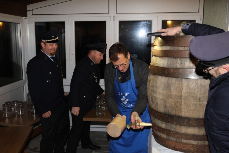 Neben dem Einschlagen von Nägeln mit der spitzen Seite eines Zimmererhammers, über das Ziehen eines Traktors samt Anhänger in den neuen Anbau des Buchberger Feuerwehrhauses sowie dem Löschen von Fackeln mittels Kübelspritze gönnte man uns eine kurze Pause, die man dazu nutzte, das mitgebrachte “Bestechungsbier” in Form eines Hirschen (210 Liter Fass) durch den Schirmherrn anzuzapfen.