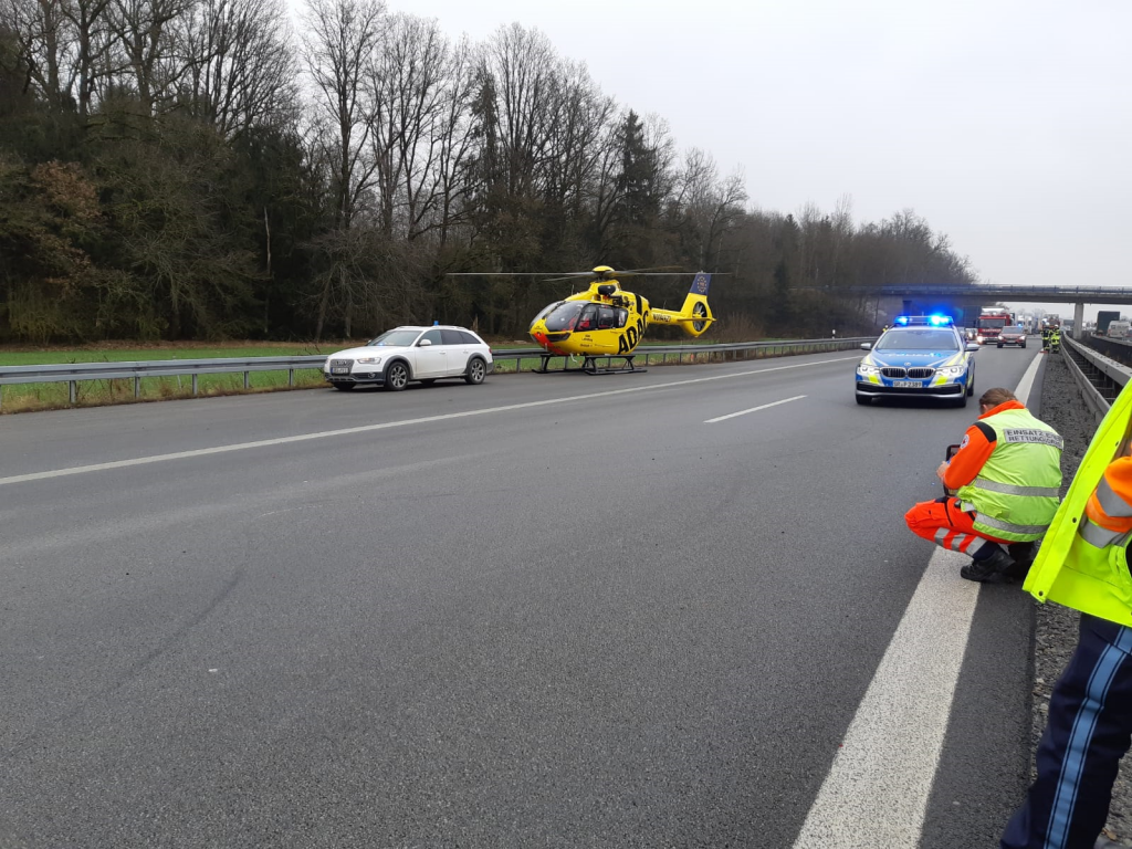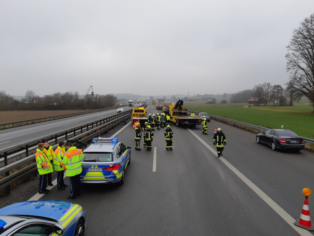 Nur knapp 26 Stunden nach dem letzten Einsatz auf der A3 wurden wir heute gemeinsam mit den Kameraden aus Metten erneut auf die A3 in Richtung Schwarzach alarmiert. Kurz nach dem Parkplatz Offenberg kam es zu einem Unfall zwischen einem PKW und einem Lieferwagen. Während der Lieferwagen schwer beschädigt auf der Standspur zum stehen kam, stand der PKW mitten auf den Fahrbahnen. Das Trümmerfeld erstreckte sich auf auf die Überholspur der Gegenseite.